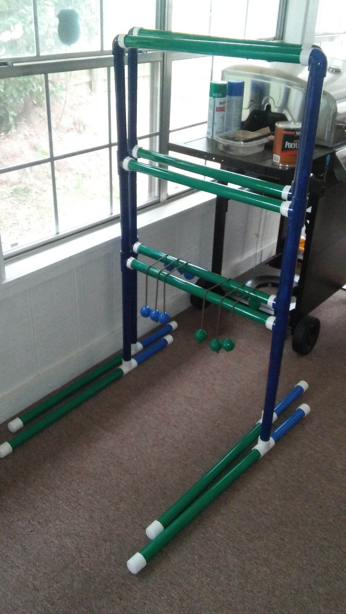Made my second set of ladders & bolos for more backyard fun. Added a coat of polyurethane on the rungs and golf balls to prevent chipping. The dark blue is a plastic penetrating formula. Time will tell if that along with poly ensure a chip/scuff resistant finish. I filled the light blue portion of the base legs with sand to weigh down the assembly since the ladder wants to sway back when the bolos catch. The T joints in the base legs are stuffed with a plastic bag so the sand stays in the front blue portion. The legs and the ladder have PVC cement. The legs should remain removable so the set can be easily packed into a car. Bolos were hand drilled and brown/green paracord was used. The ends are tied off and taken a light flame to melt and solidify the nylon.